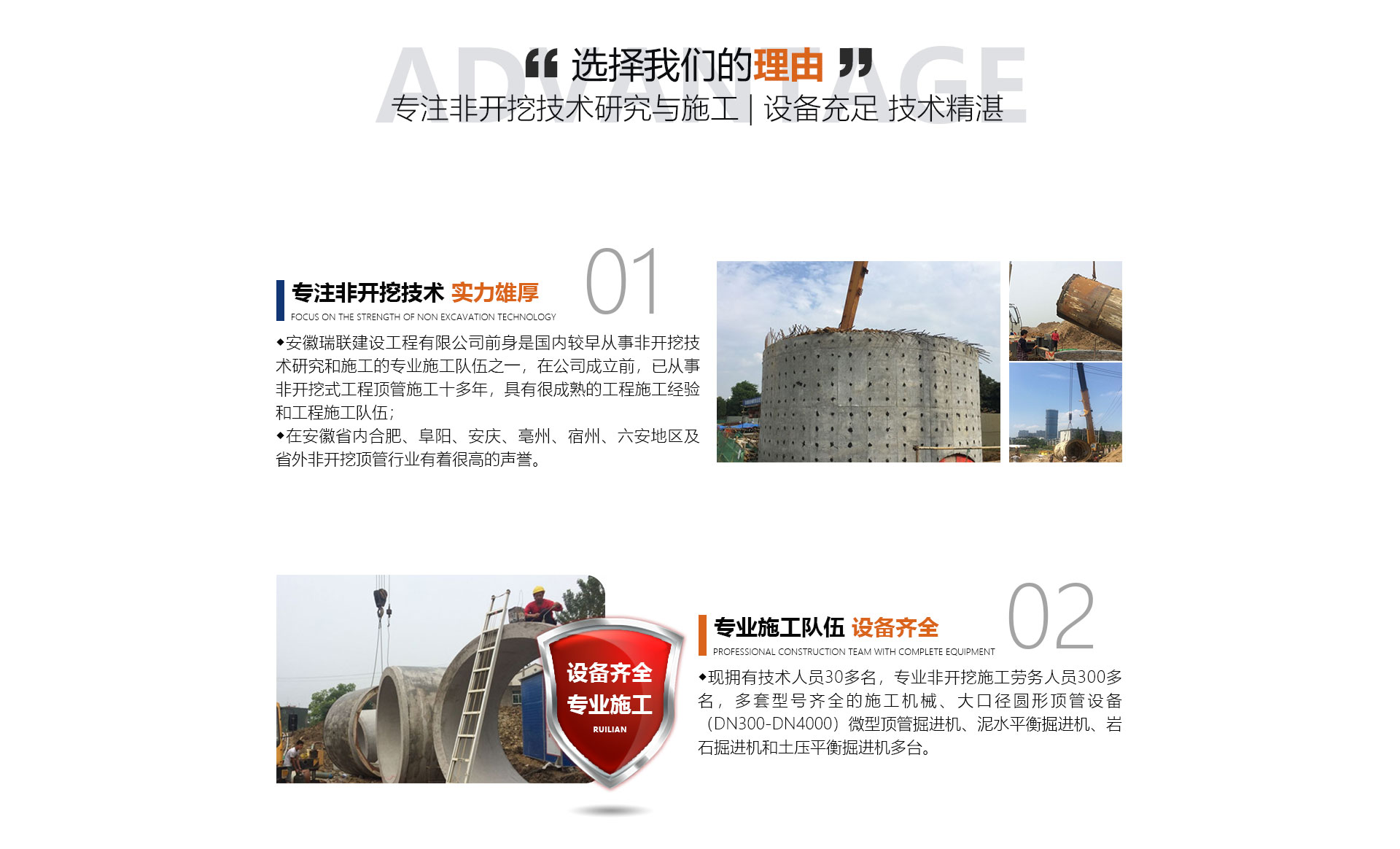 安徽瑞聯(lián)建設(shè)工程有限公司前身是國(guó)內(nèi)較早從事非開挖技術(shù)研究和施工的施工隊(duì)伍之一,在公司成立前,已從事非開挖式工程頂管施工十多年,具有很成熟的工程施工經(jīng)驗(yàn)和工程施工隊(duì)伍,在安徽省內(nèi)合肥、阜陽(yáng)、安慶、亳州、宿州、六安地區(qū)及省外非開挖頂管行業(yè)有著很高的聲譽(yù)。面對(duì)日益擴(kuò)大的市場(chǎng),公司于2014年正式成立,公司擁有勞務(wù)分包及市政公用工程總承包資質(zhì)。公司優(yōu)勢(shì)(文字):現(xiàn)擁有中高技術(shù)人員30多名,非開挖施工勞務(wù)人員300...